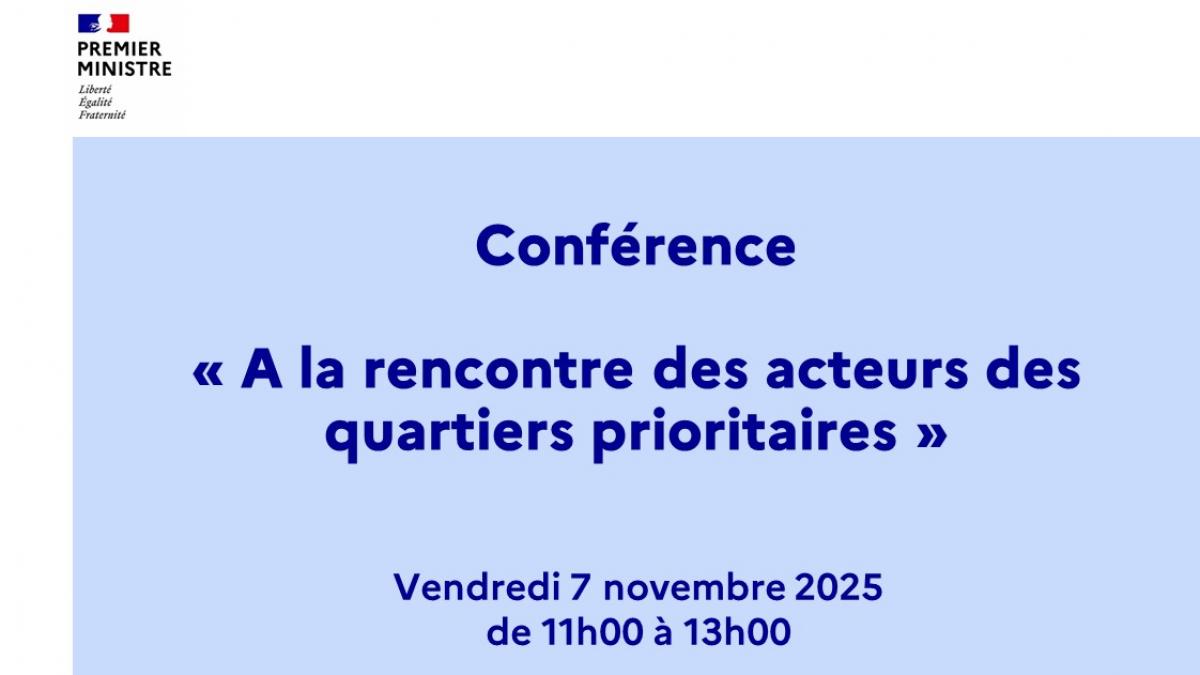 Grands enjeux Temps de lecture : 1 minute Conférence - À la rencontre des acteurs des quartiers prioritaires Les intervenants viendront partager leur expérience du terrain, parfois éloignée des représentations, et apporter des clés de compréhension sur ce qui s’y joue, ainsi que sur la manière dont les politiques publiques peuvent s’y déployer. Partager la page Partager sur Facebook - nouvelle fenêtre Partager sur Twitter - nouvelle fenêtre Partager sur Linked In - nouvelle fenêtre Partager par email - nouvelle fenêtre Copier le lien dans le presse-papier Cette conférence est proposée par Claire Landais, secrétaire générale du Gouvernement et Isabelle Braun-Lemaire, déléguée interministérielle à l'encadrement supérieur de l’État avec le concours de Nicolas GRIVEL, ancien directeur général de l’Agence nationale pour la rénovation urbaine et actuel directeur général de la Caisse nationale des allocations familiales (CNAF). Cet évènement accueillera : Catherine Arenou, maire de Chanteloup-les-Vignes Philippe Rio, maire de Grigny Vendredi 7 novembre 2025 de 11h à 13hPour y assister, réservez votre place via le lien suivant : https://evdr.co/ptuqfw