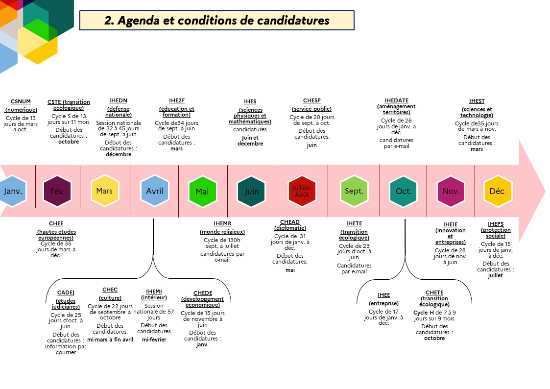 Les cycles thématiques Temps de lecture : 1 minute Partager la page Partager sur Facebook - nouvelle fenêtre Partager sur Twitter - nouvelle fenêtre Partager sur Linked In - nouvelle fenêtre Partager par email - nouvelle fenêtre Copier le lien dans le presse-papier Dans cette rubrique Les cycles Le Cycle des hautes études de service public (CHESP) Le Cycle supérieur de développement managérial (CYSDEM) Les cycles thématiques Il existe également des cycles thématiques, proposés par différents instituts de formation, ouverts aux candidatures, détaillés ci-dessous : Télécharger la frise JPG - 154.6 KB Réunion des instituts et des cycles des hautes études : vers une synergie renforcée La DIESE a réuni les responsables des principaux instituts et cycles de hautes études, tous acteurs de la formation des cadres supérieurs de l’État.L'objectif est de mieux se connaître, mieux coopérer, et mieux répondre aux défis communs de formation des cadres supérieurs. Lire l'actualité En savoir plus sur les cycles L’IHEDN Le CHEC L’IH2EF Le CHEDE Le CADEJ L’IHEMI Le CSDD L’IHEDATE Le CHEAD L’IHEE Le CHEE L’IHEPS Le CSNUM