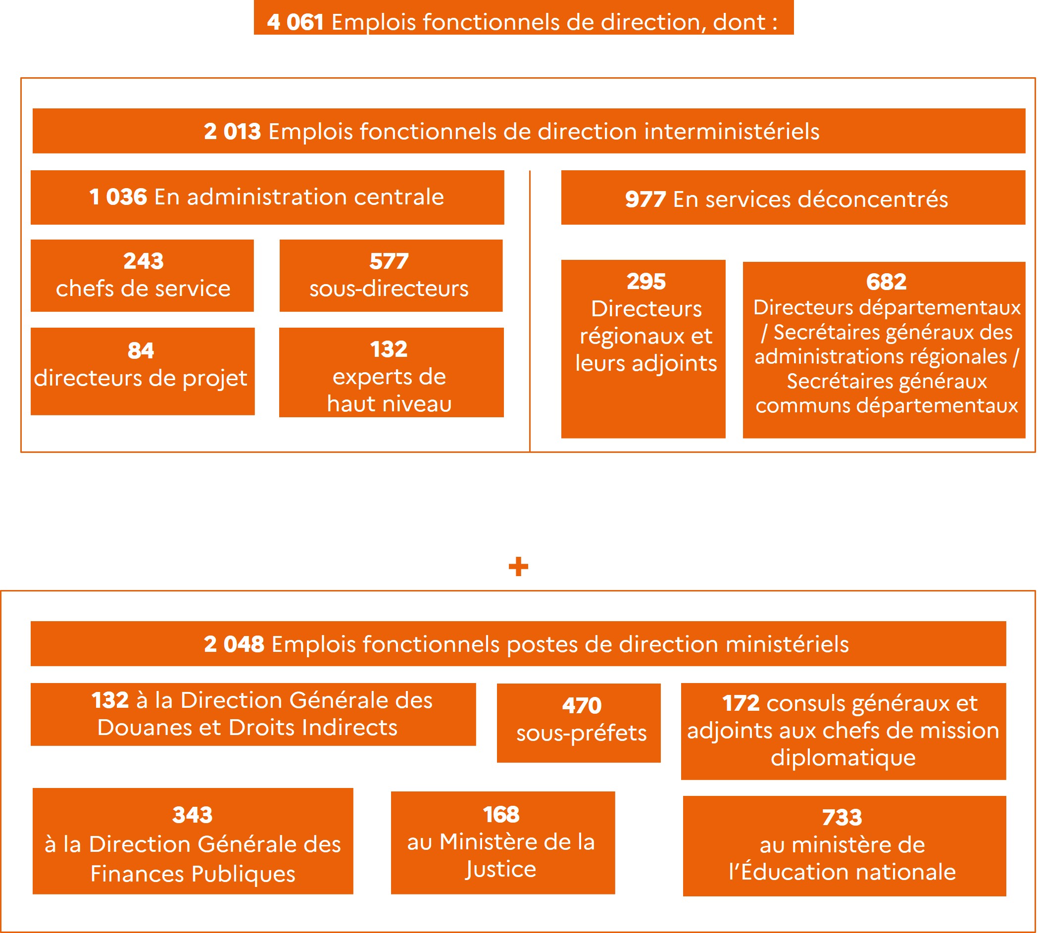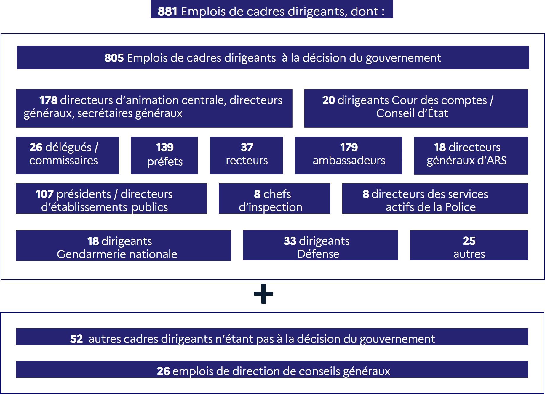 Le périmètre de l’encadrement supérieur de l’État Temps de lecture : 3 minutes Partager la page Partager sur Facebook - nouvelle fenêtre Partager sur Twitter - nouvelle fenêtre Partager sur Linked In - nouvelle fenêtre Partager par email - nouvelle fenêtre Copier le lien dans le presse-papier Dans cette rubrique L’encadrement supérieur de l’État Le périmètre de l’encadrement supérieur de l’État Les voies d’accès Le décret n° 2022-760 du 29 avril 2022 portant application de l’article L. 412-1 du code général de la fonction publique détermine le périmètre de l’encadrement supérieur de l’État. Il recouvre les agents qui : occupent des emplois à la décision du Gouvernement ; sont détachés dans des emplois fonctionnels de direction de l’État ; occupent des emplois de dirigeant exécutif des établissements publics de l’État, ou dans certains d’entre eux, des fonctions exécutives de haut niveau ; exercent certaines fonctions supérieures de direction, d’encadrement, d’expertise ou de contrôle ; peuvent prétendre, en raison de leur parcours, aux fonctions précédemment énumérées. Dans les pratiques de gestion des ressources humaines de l’encadrement supérieur de l’État, afin de proposer l’accompagnement le plus pertinent aux cadres supérieurs, ces cinq items sont répartis en trois sous-ensembles : les cadres dirigeants ; les cadres de direction détachés dans un emploi fonctionnel ; les autres cadres supérieurs. Présentation juridique de l’encadrement supérieur en cinq items Le périmètre de l’encadrement supérieur de l’État est juridiquement décomposé en cinq items. Les emplois à la décision du Gouvernement Les emplois à la décision du Gouvernement sont ceux régis par les articles L. 341-1 et suivants du code général de la fonction publique. Ce sont des emplois supérieurs pour lesquels la nomination est laissée au choix du Gouvernement. Ils sont essentiellement révocables, contrairement aux principes qui régissent les fonctions administratives plus classiques. Cela signifie que leur titulaire, eu égard aux missions qu’il exerce et au niveau de responsabilité qui en découle, est associé de manière étroite à la mise en œuvre de la politique du Gouvernement. Les principaux emplois concernés sont les suivants : Les emplois fonctionnels de direction de l’État Les emplois fonctionnels de direction de l’État sont ceux régis par les articles L. 342-1 et suivants du code général de la fonction publique et par le décret n° 2019-1594 du 31 décembre 2019 relatif aux emplois de direction de l’État. Les emplois des établissements publics de l’État Les plus hauts dirigeants exécutifs des établissements publics de l’État appartiennent à l’encadrement supérieur, à l’exception de ceux occupant des fonctions dans des établissements publics de santé ou médico-sociaux ; des chambres de commerce et d’industrie, des chambres de métiers et de l’artisanat et des chambres d’agriculture ; des établissements publics relevant des livres IV et VII du code de l’éducation ou du livre III du code de la recherche. Dans certains établissements publics de l’État, des fonctions exécutives de haut niveau sont considérées comme relevant également de l’encadrement supérieur. La liste de celles-ci est prévue par l’annexe I du décret n° 2022-760 du 29 avril 2022 portant application de l’article L. 412-1 du code général de la fonction publique. Les fonctions supérieures de direction, d’encadrement, d’expertise ou de contrôle Les agents qui appartiennent aux corps ou occupent un des emplois suivants sont considérés comme relevant de l’encadrement supérieur : Les agents occupant des fonctions pouvant prétendre, en raison de leur parcours à des emplois fonctionnels ou des corps de l’encadrement supérieur Relèvent enfin de l’encadrement supérieur les agents occupants ou ayant occupé des fonctions susceptibles de leur permettre d’accéder aux fonctions précédemment énumérées (hormis les emplois à la décision du Gouvernement). Les critères retenus pour les identifier sont les suivants : le parcours professionnel suivi ; la nature et la durée des missions exercées ; le niveau de responsabilité et le degré d’autonomie ; le cas échéant, la taille des équipes encadrées ; les compétences et l’aptitude à exercer des fonctions supérieures de direction, d’encadrement, d’expertise ou de contrôle. Regroupement en trois sous-ensembles de gestion De façon plus concrète en matière de gestion des ressources humaines, afin de proposer l’accompagnement le plus pertinent possible aux cadres concernés, il est courant de distinguer trois grands types de fonctions au sein de l’encadrement supérieur de l’État : les cadres dirigeants qui regroupent les cadres sur emplois à la décision du Gouvernement ; les cadres de direction qui regroupent les cadres sur emploi fonctionnel de direction ; les autres cadres supérieurs. Articles relatifs au périmètre de l’encadrement supérieur de l’État Observatoire des cadres supérieurs Textes relatifs au périmètre de l’encadrement supérieur de l’État